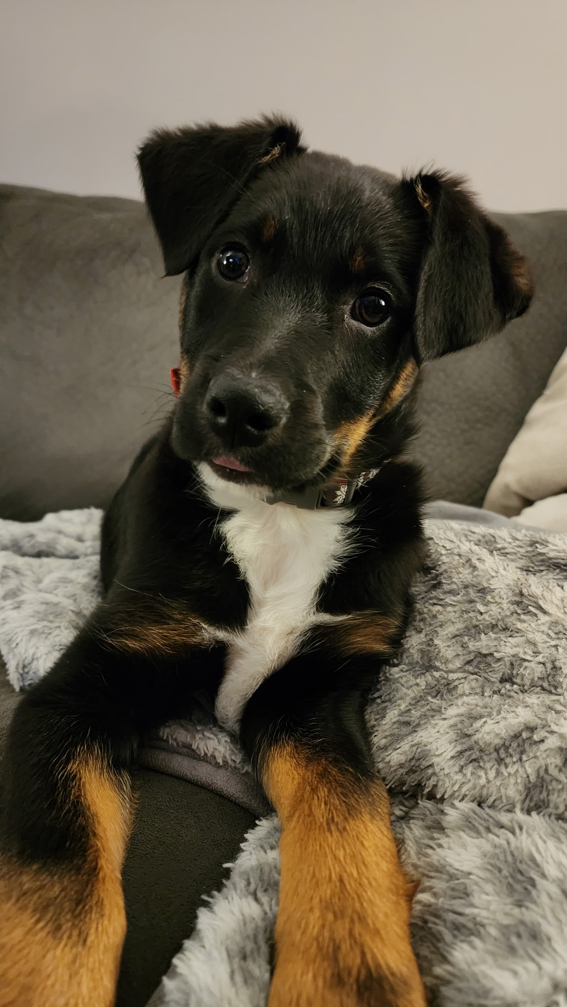 He’s doing really well with house training for his age and knows that outside is the place to go. He’ll even ask! If you don’t respond fast enough, he might improvise (hey, he’s still a baby). Puppy pads by the door have been a big help, and he’s improving every day.