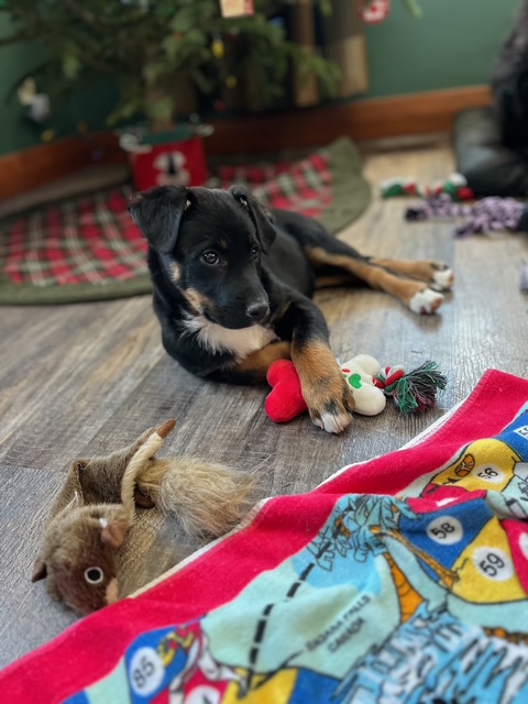 This little guy has big puppy energy. He loves chewing, playing hard, and turning the snow into his personal gymnastics course — complete with somersaults, deer hops, and victory laps. He even plays a mean game of soccer! When he’s excited to see you, he’ll greet you with the cutest little puppy bark you’ve ever heard.
