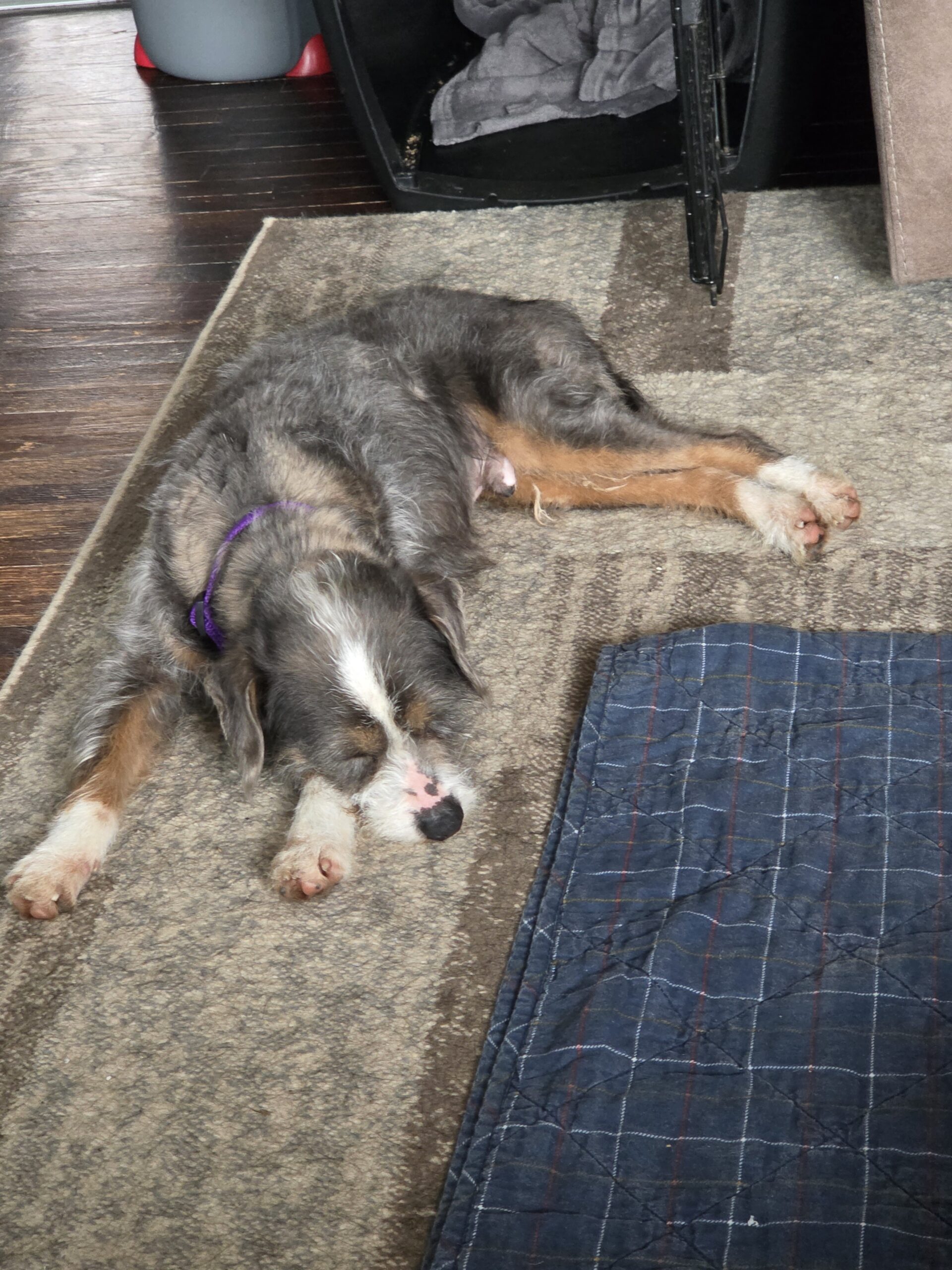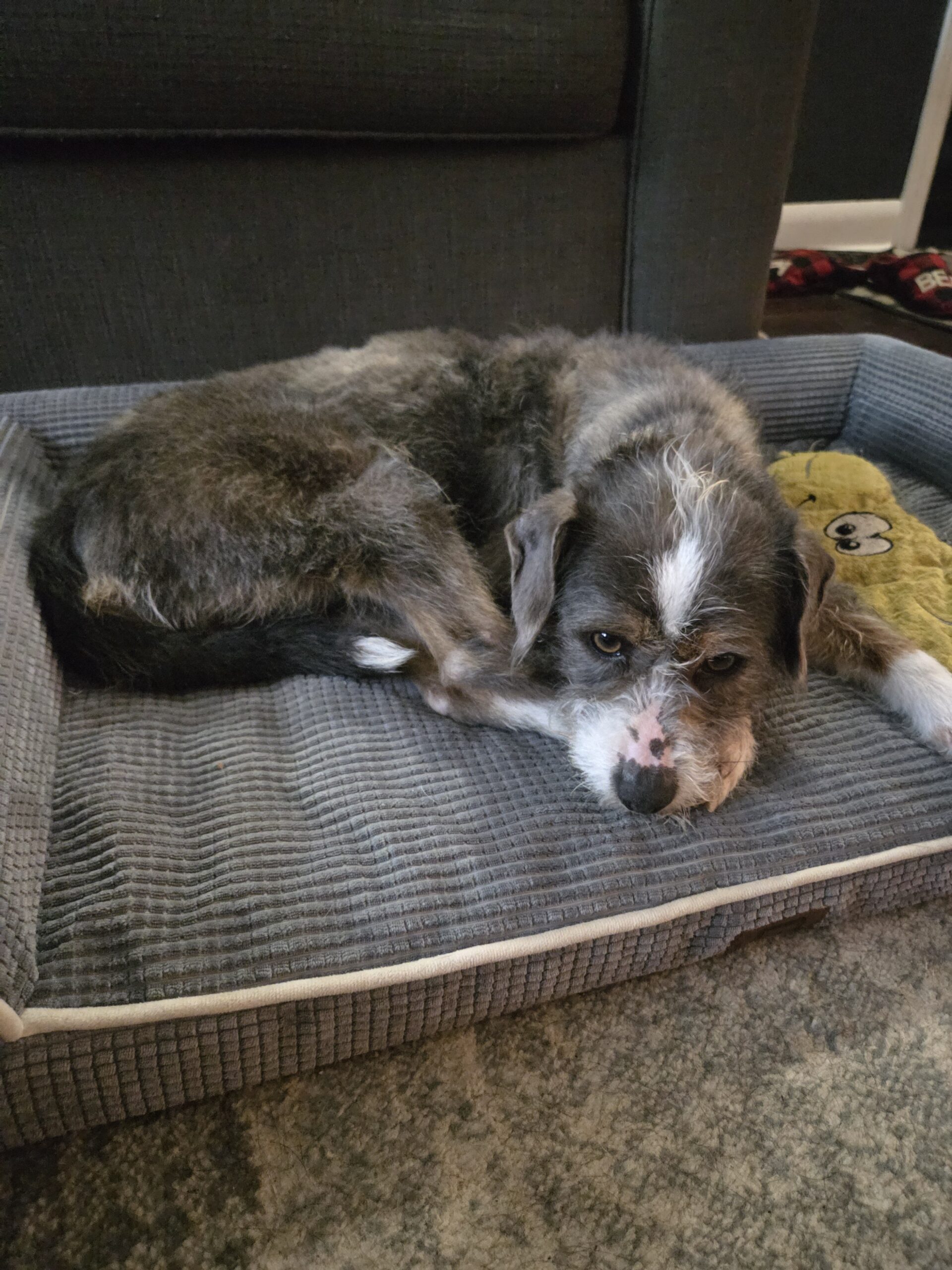 At night, Luka sleeps in bed with his foster mom. He enjoys some cuddles with his people but is also very content snuggling up with his toys and relaxing nearby.